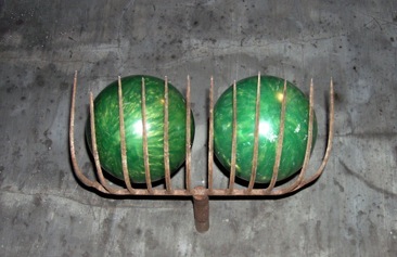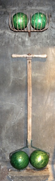double pitchfork, lawn mower, four yellow/green bowling balls,